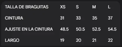 | Talle | Largo (cm) | Cintura (cm) | Cadera (cm) |