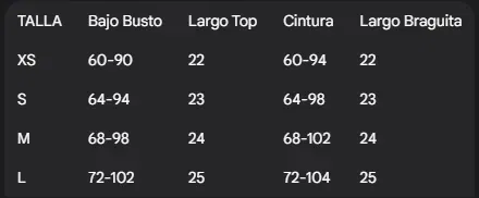 | Talla | Bajo Busto | Largo corpiño | Cintura | Largo Braguita |